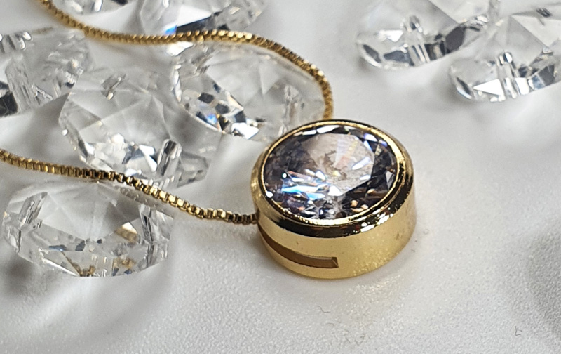 Gran colgante bañado en oro 21kts con engaste de cristal blanco facetado. Cadena de 45cm