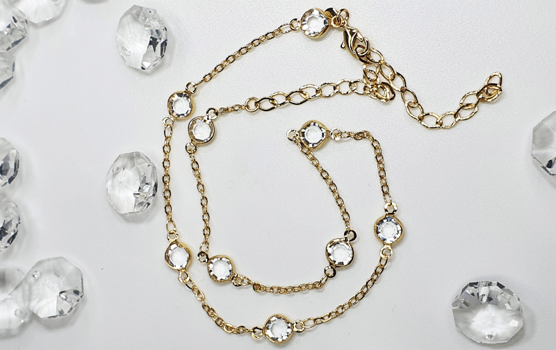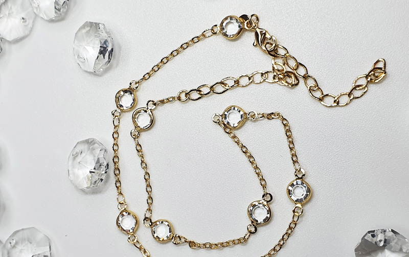 Collar con alargue bañado en oro 21kts con engaste de cristales blancos facetados entre eslabones