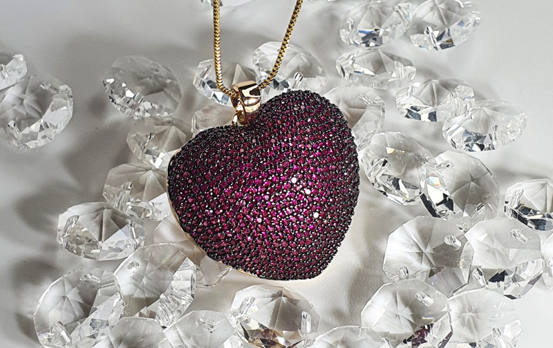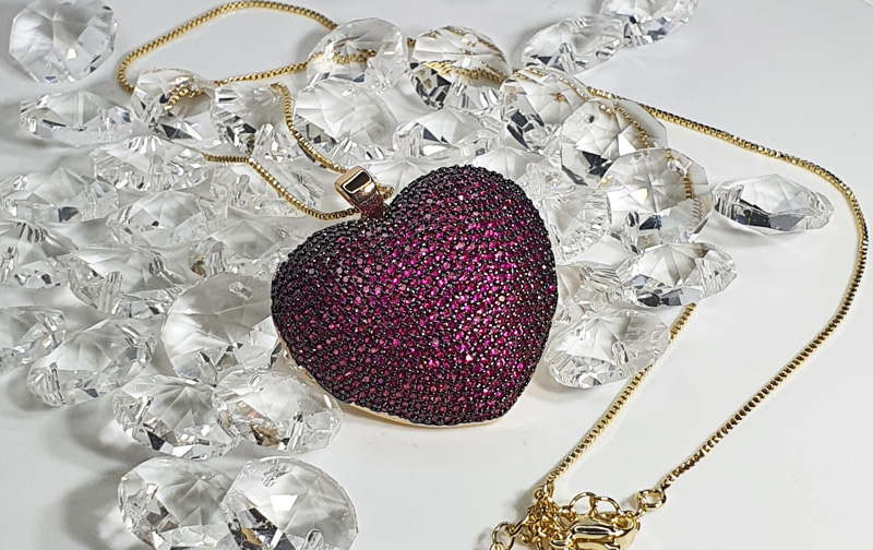 Colgante grande bañado en oro 21kts con engaste de cristales rubíes facetados. 40cm con alargue de cadena