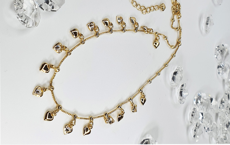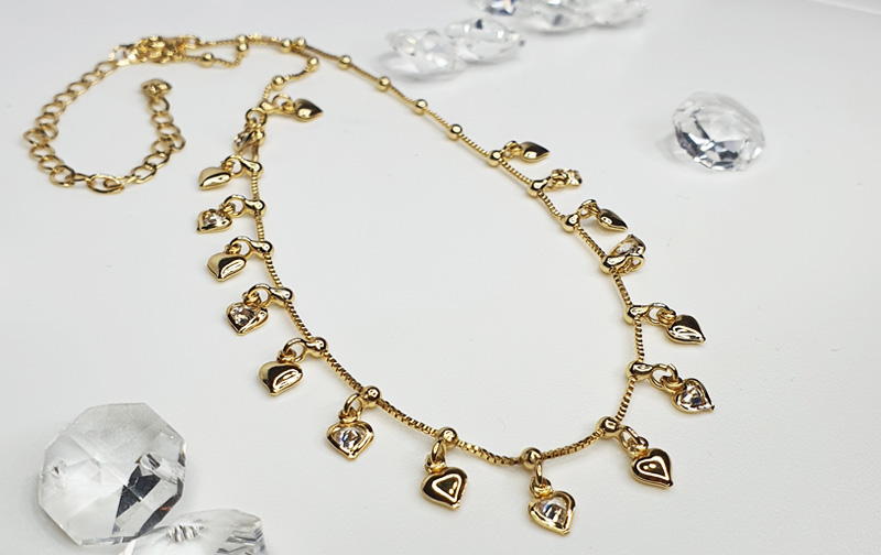 Collar choker bañado en oro 21kts con alargue y pequeños corazones colgantes